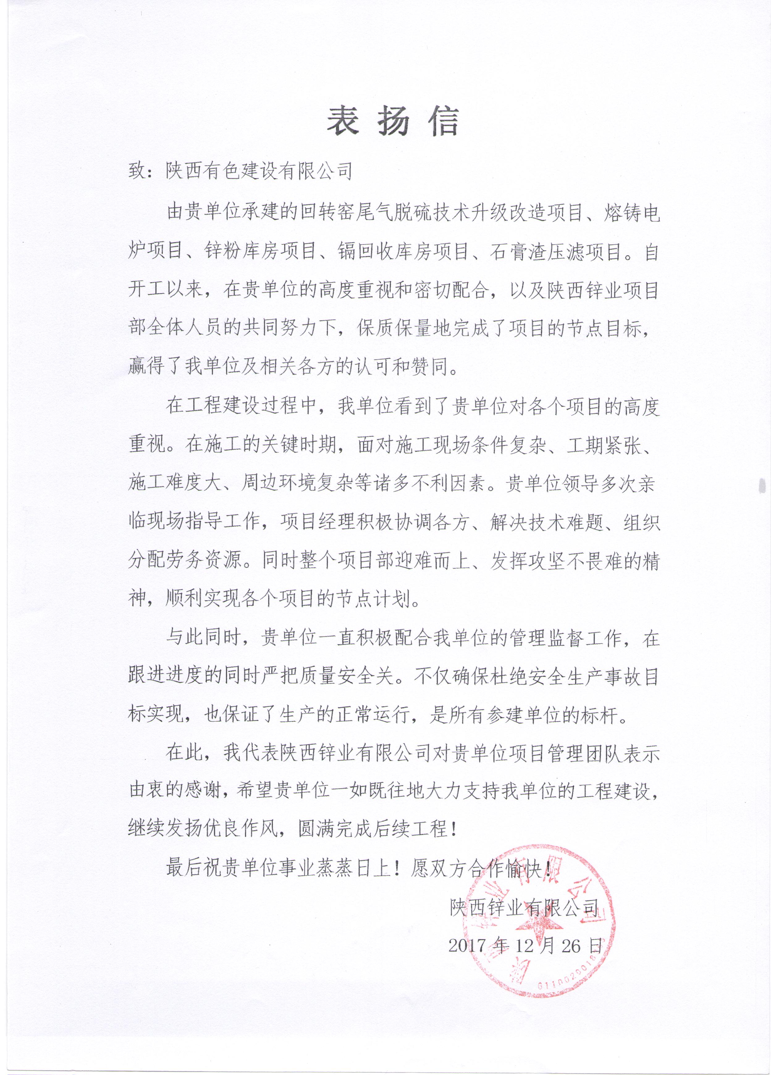 近日,公司收到陜西鋅業(yè)有限公司發(fā)來的表揚信,公司陜西鋅業(yè)項目部在回轉(zhuǎn)窯尾氣脫硫技術(shù)升級改造等5個項目建設(shè)過程中取得的成績表示感謝和高度贊揚。